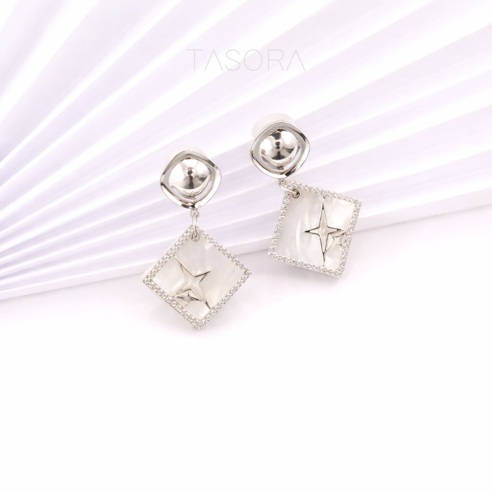 Square-shaped drop earrings with a mother-of-pearl base